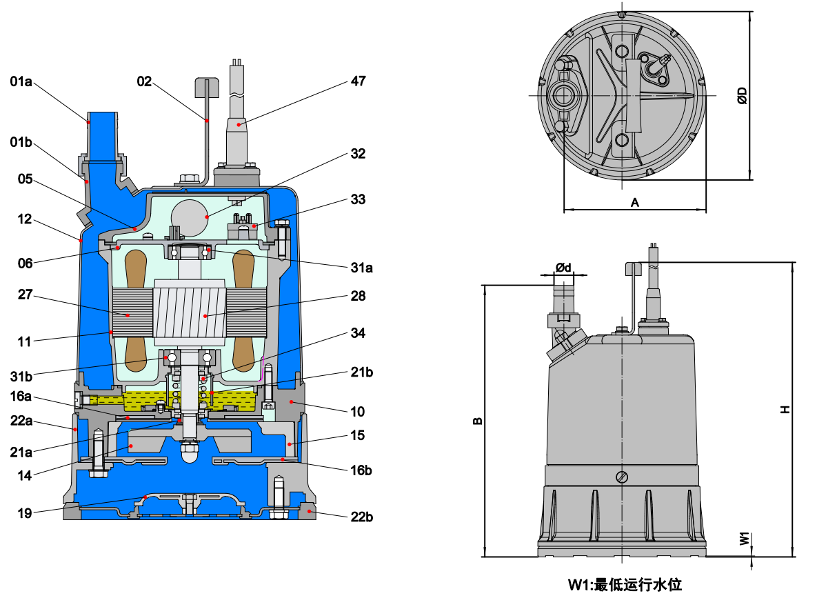 FCM系列吸干潜水泵是一种便携式潜水式残排放泵。底部进水口设计有单向阀,可防止管路中的水在泵运行停止后回流,最低水位可抽至1mm。电泵采用轻量化设计;水泵外径小,有利于在狭窄的空间使用;泵部件采用耐磨橡胶和球墨铸铁,具有优异的耐用性。水从底部吸入、经电机壳与水套夹层由顶部排出,给电机提供最高的冷却效率,允许低水位连续运行;半开式叶轮与泵体间有大间隙,叶轮不易被泥砂卡死。出水接头可以竖直或倾斜安装,可防止排放软管折叠或弯曲。